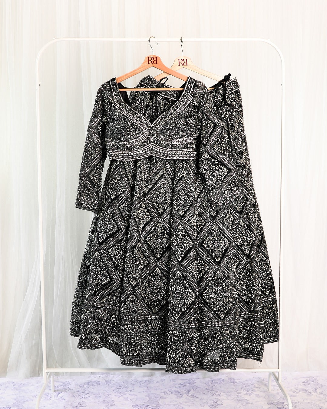 This lengha set features a heavily embellished black skirt adorned with black pearls, crystals, and sequins for a rich, textured finish. The detailing is dense and uniform, giving the skirt a sculpted, high-shine appearance. It is paired with a matching black blouse that is equally heavy in beadwork, using pearls and crystals to create a cohesive and structured look. The set is formal, weighty, and designed for evening wear or special occasions where maximum impact is desired.