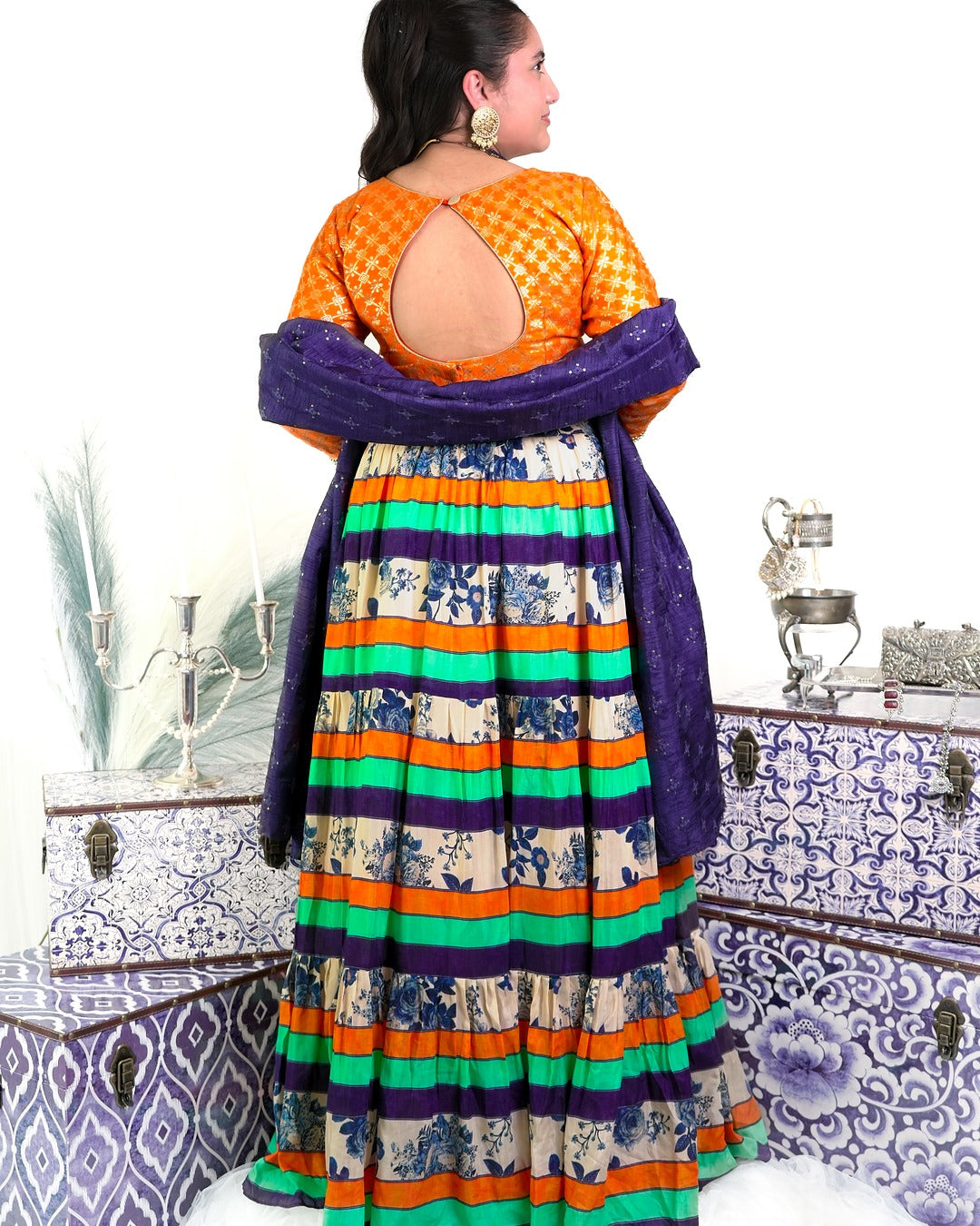 A beautifully tiered lengha with white and blue flowers layered with navy and teal. A soft orange silk blouse captures the essence of this Summer Lovin' outfit, perfect for that garden wedding