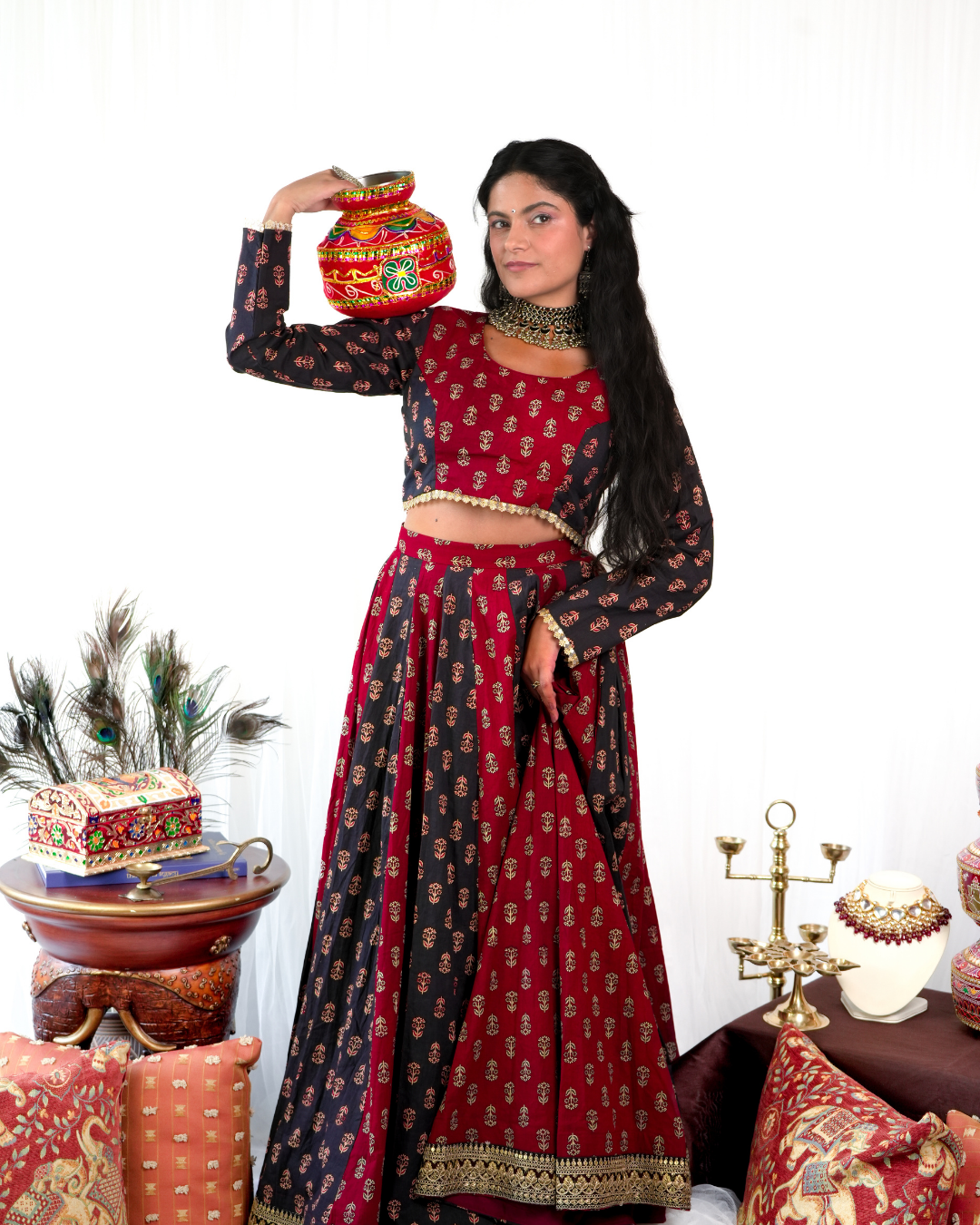 Our panelled Ranglo Set will have you living your #GujjuGirl fantasies. In a soft 100% cotton, this 11-mtr flair skirt is perfect for any Sangeet or Navratri.